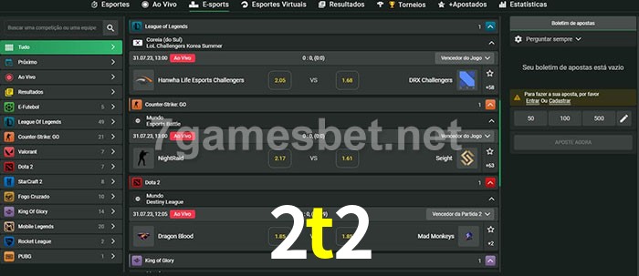 O 2t2 oferece uma grande seleção de opções de apostas em e-sports com probabilidades competitivas